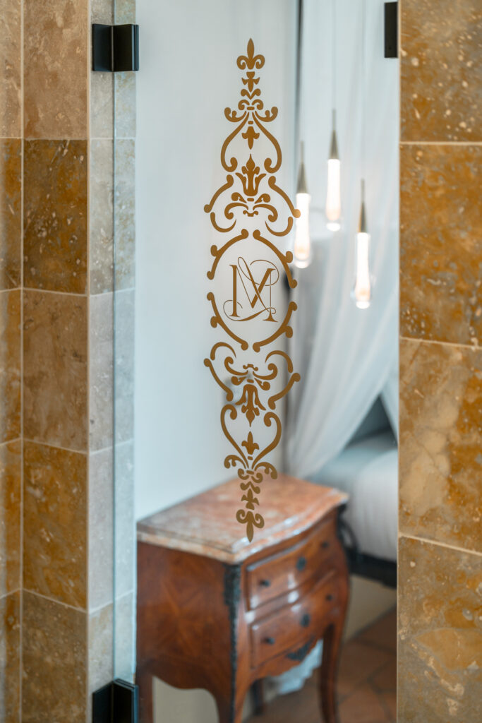 The second bedroom feels fit for a princess. It is furnished with original 19th-century Venetian pieces, hand-painted with delicate floral motifs. Persian silk carpets, original paintings, flowers at the windows, and an adjacent travertine bathroom complete the atmosphere of unpretentious luxury.