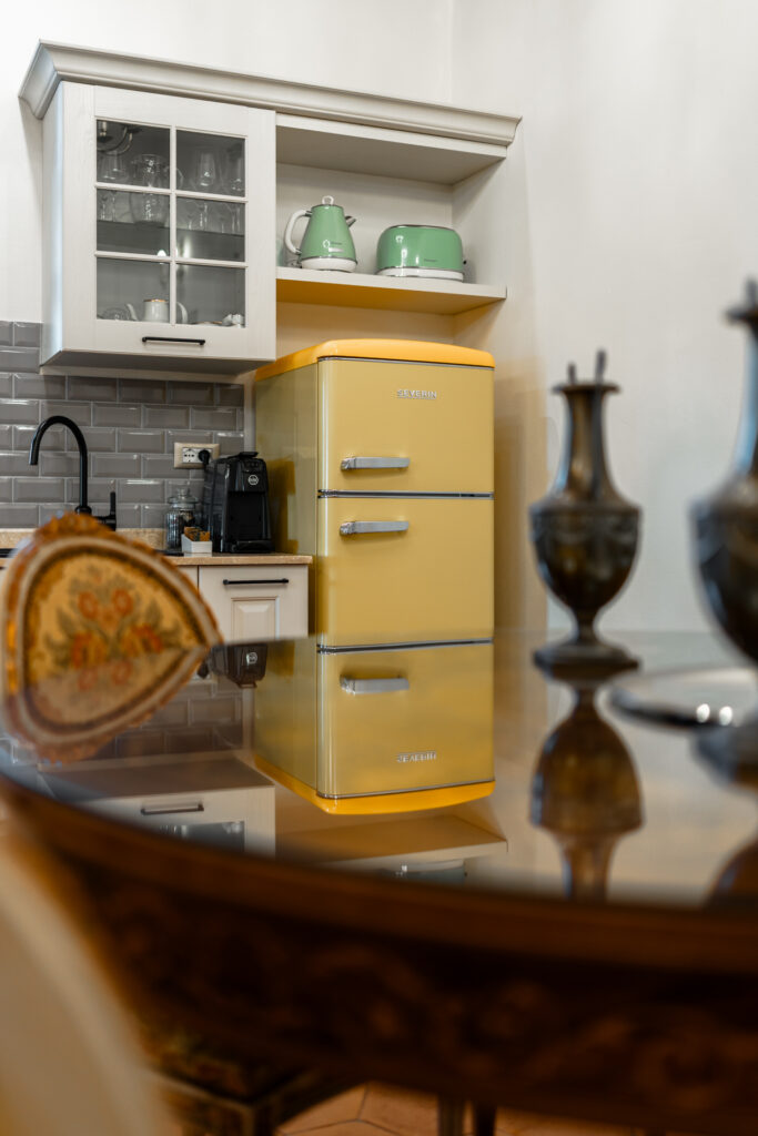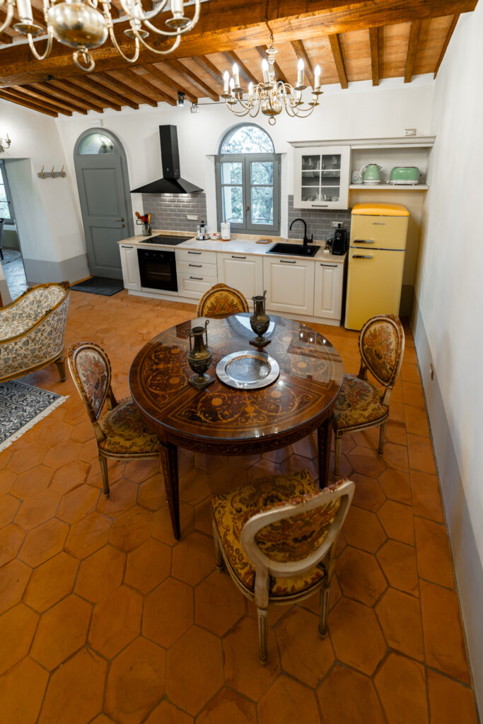 The elegant living room features vintage Italian seating from the 19th century and a large decorative mirror. The fully equipped kitchen includes a round dining table and a stylish wine rack. Three brass chandeliers complete the space.