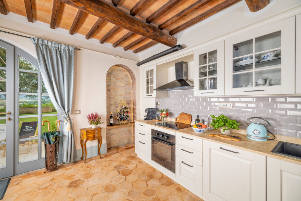 The spacious living room opens onto the surrounding greenery through two large arched glass doors. Just across the lawn, a viewing platform offers the perfect spot to admire the countryside while sipping your morning coffee or tea. A fully equipped kitchen, styled in white and blue tones, along with Louis XV–style furnishings, completes the space. It’s easy to dream of being descended from royalty here.