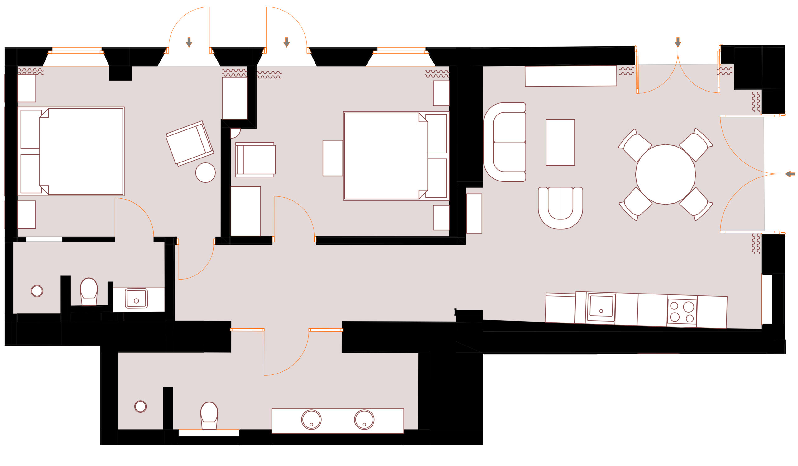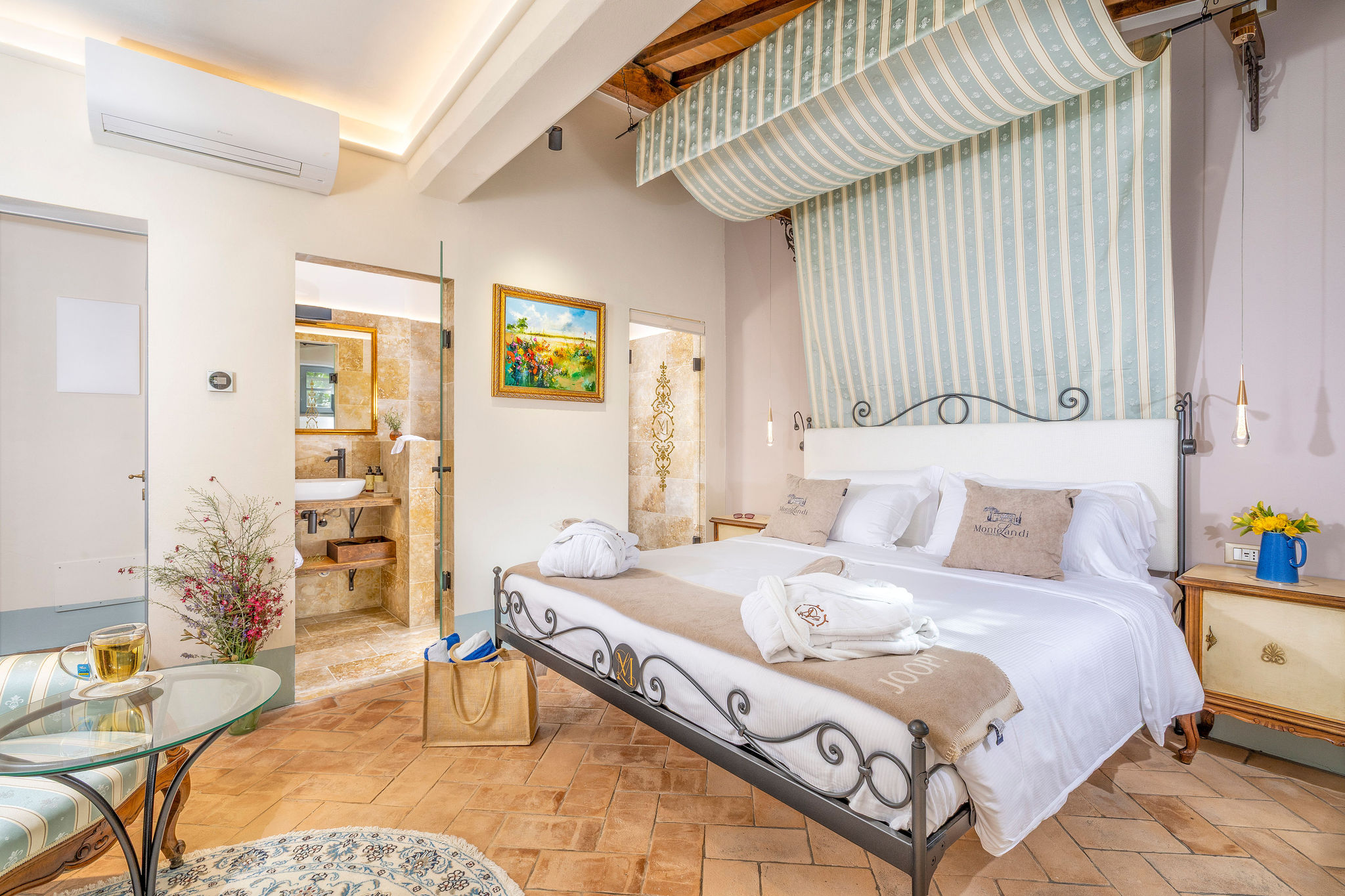 Vento di Lavanda (Lavender Breeze) is a two-bedroom apartment with direct access from the panoramic terrace—just steps from the reception and breakfast area. Its rooms are filled with morning light, while the scent of flowers drifts gently through the air.