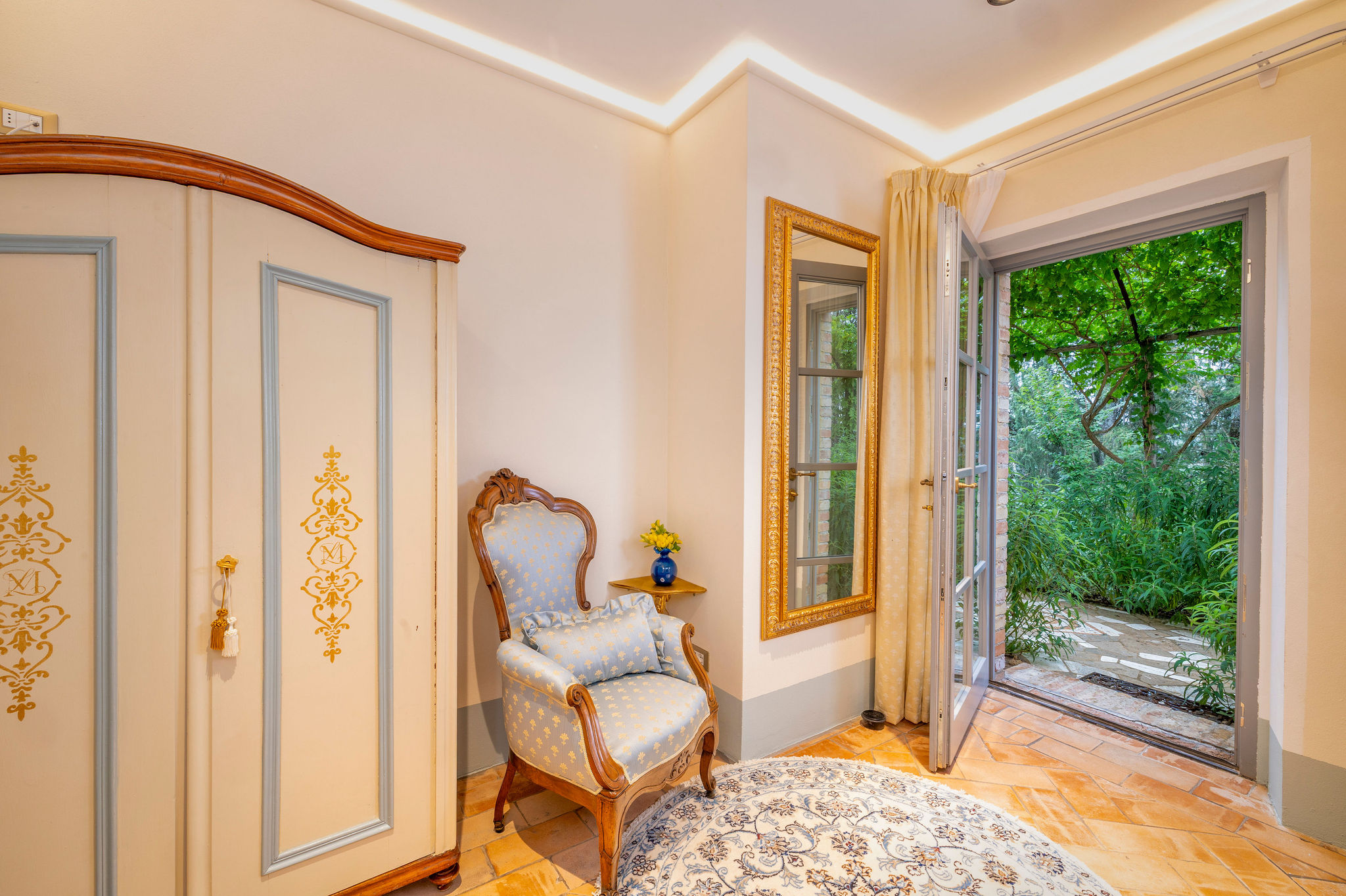 The second bedroom, with its dreamy canopy bed and en-suite bathroom, is complemented by golden-hued furnishings and lavish curtains. Both bedrooms have private doorways leading directly to the fragrant wisteria and lavender path.